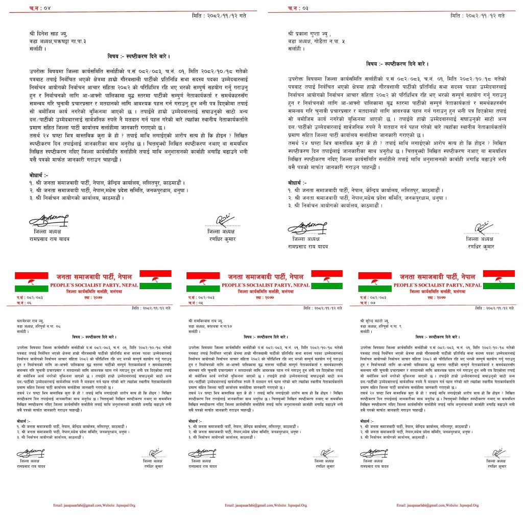सर्लाही, फागुन — जनता समाजवादी पार्टी, नेपाल (जसपा नेपाल) जिल्ला कार्यसमिति सर्लाहीले प्रतिनिधि सभा सदस्य पदको निर्वाचनमा पार्टीका आधिकारिक उम्मेदवारलाई असहयोग गरेको आरोपमा स्थानीय तहमा निर्वाचित पाँच जना जनप्रतिनिधिसँग २४ घण्टे लिखित स्पष्टीकरण माग गरेको छ।